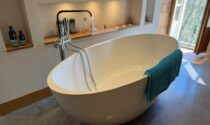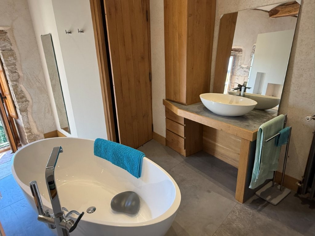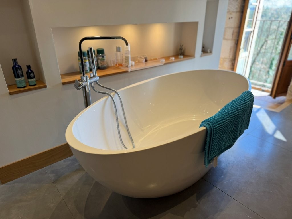 The principal bathroom, en-suite to the main bedroom, features a luxurious freestanding bath perfectly positioned to take in open sky and countryside views.