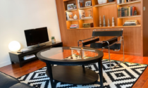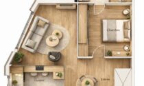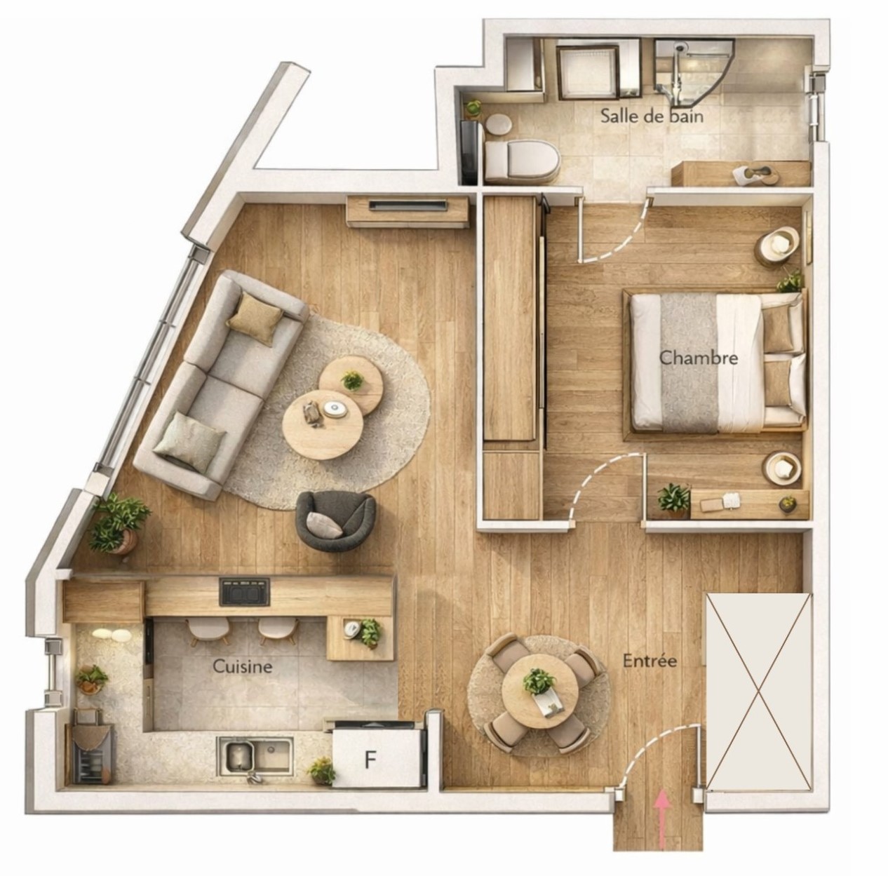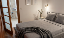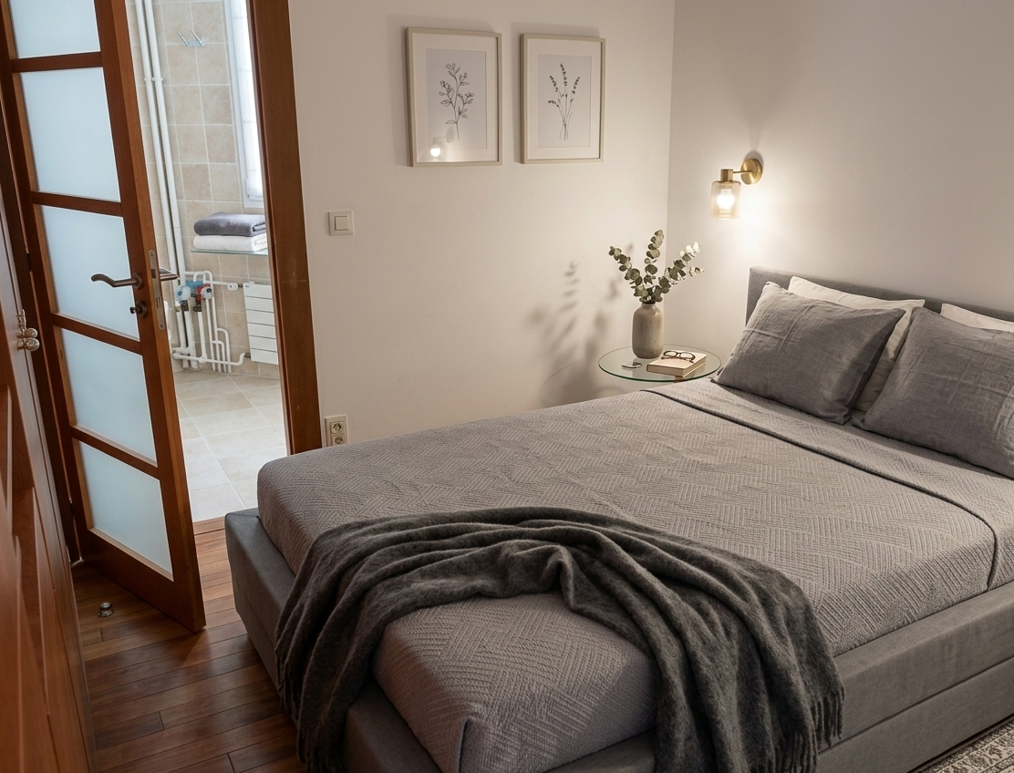 The bedroom offers a peaceful retreat, with a calm layout and warm finishes that ensure comfort and privacy. The bathroom features a walk-in shower, completing the practical and modern setup of the apartment.