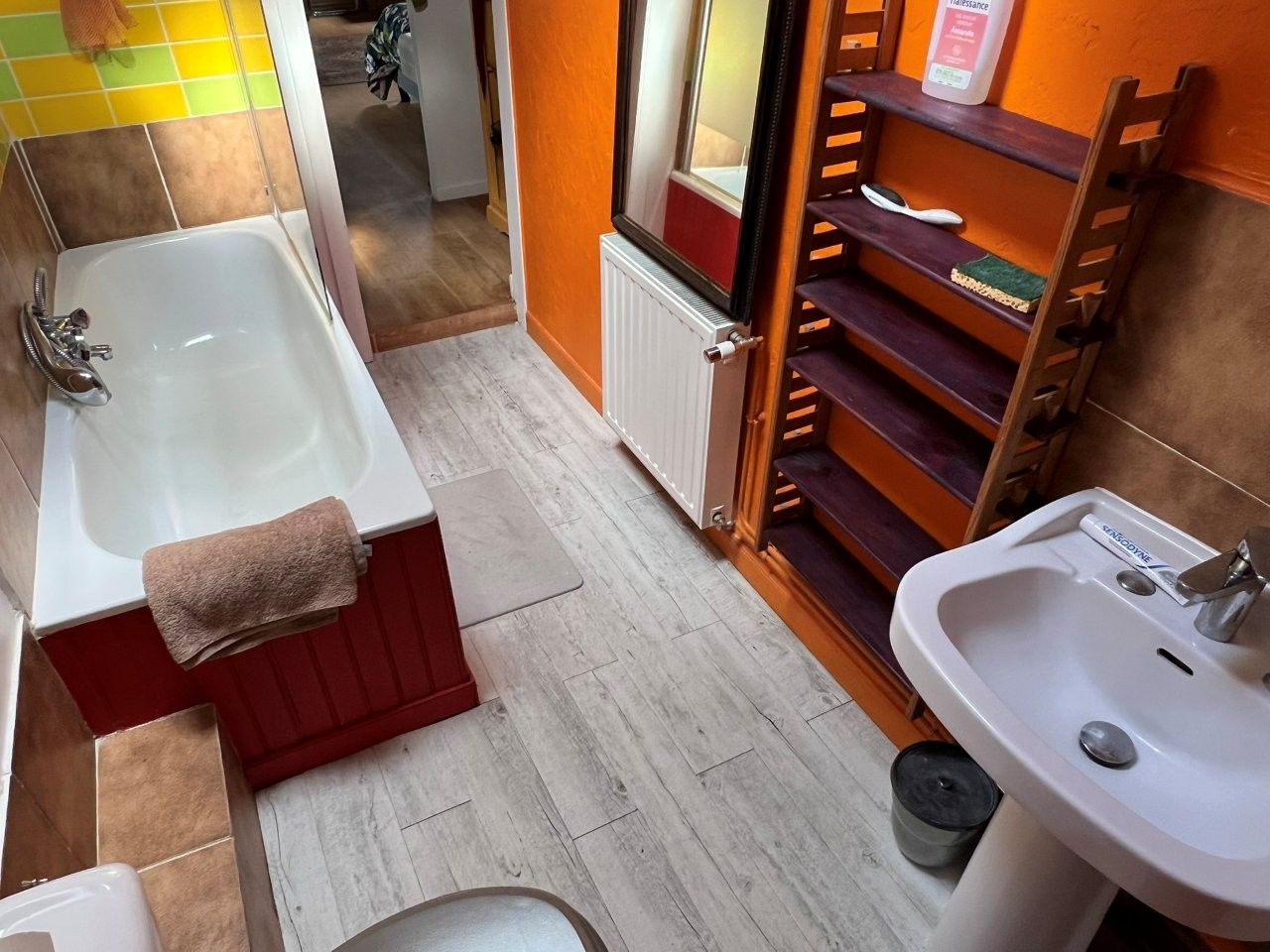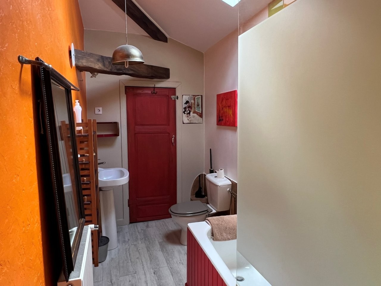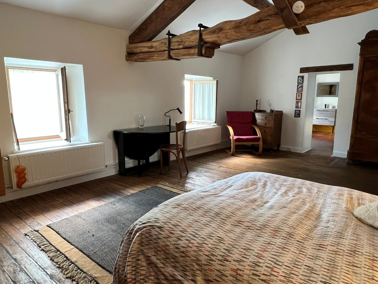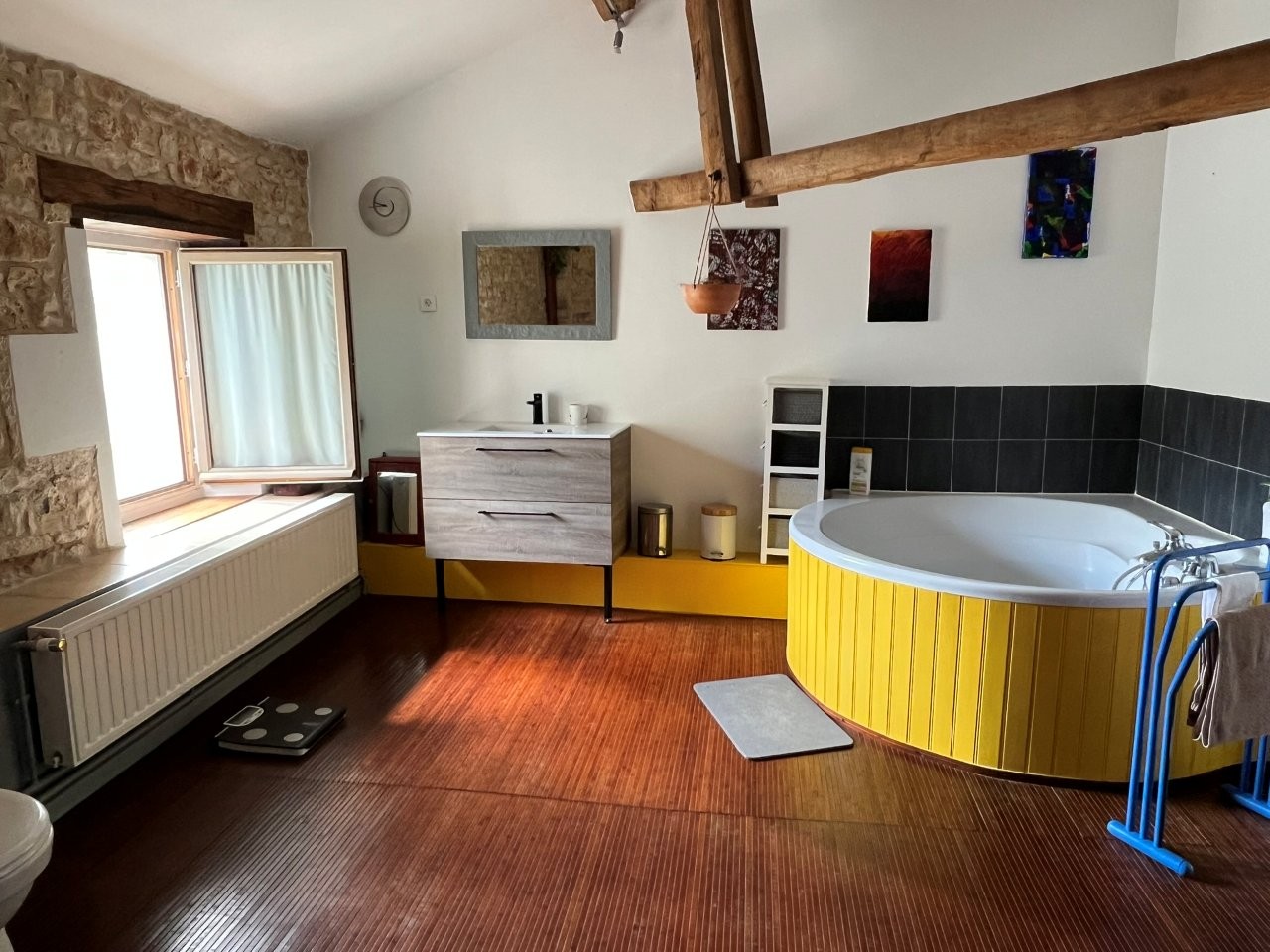 Bedroom 4 – 30 m² (wood flooring, exposed beams) with private bathroom (16 m², WC, sink, bathtub, beams, stone walls)