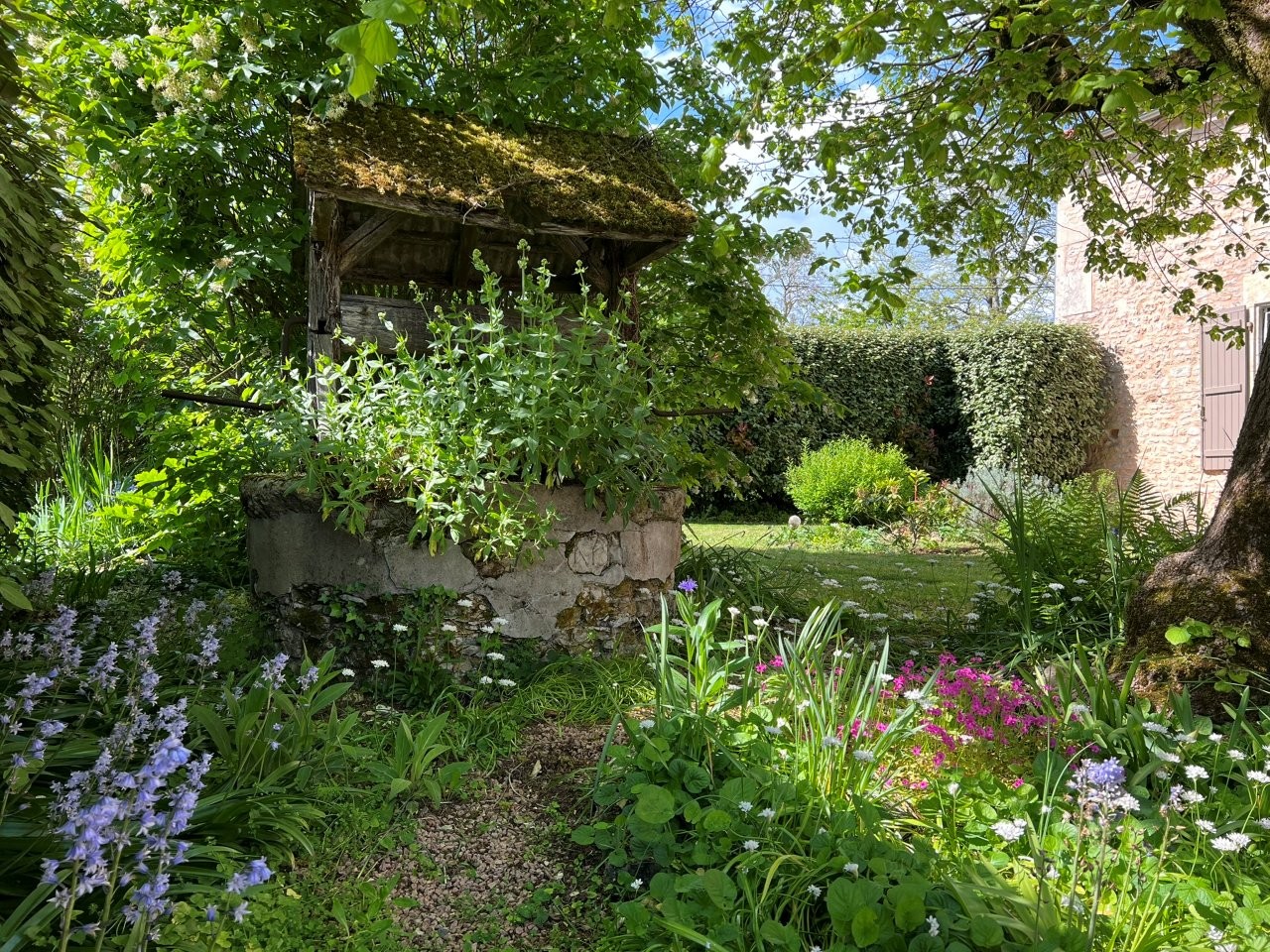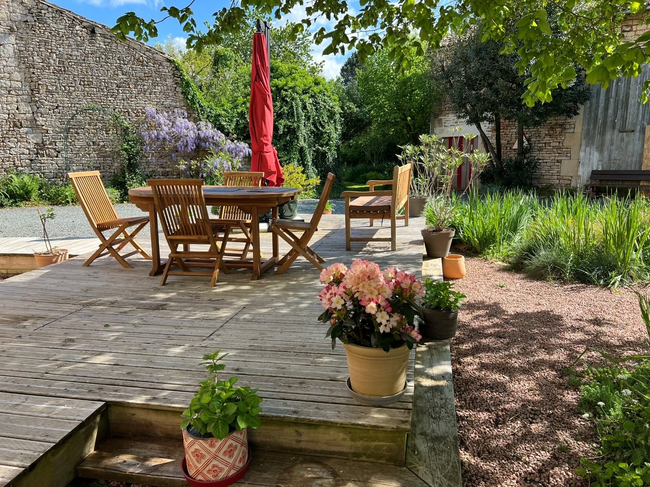 Hidden behind a private gate, you’ll find a lovely flower-filled courtyard, a welcoming terrace, and a beautifully maintained garden bordered by hedges—an oasis of tranquility.