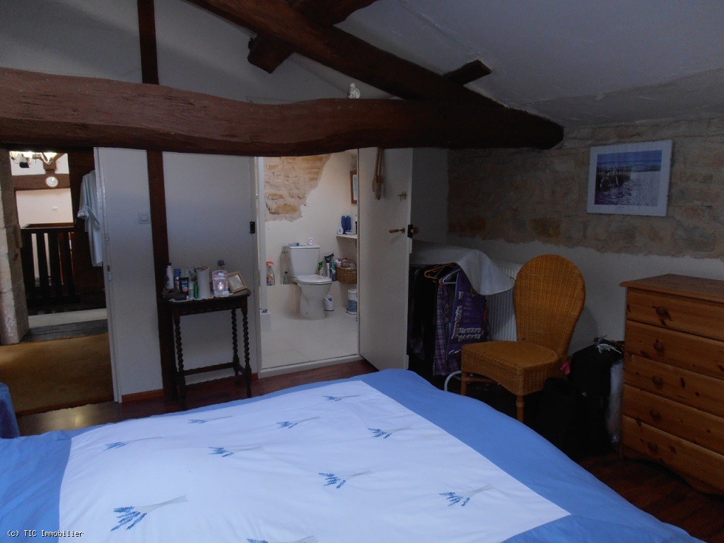 Bedroom 4 (14m2) Laminate floor. Beam. Stone walls. En-suite shower room (4.5m2) Tiled floor. Shower. WC. Basin. Beam/stone walls. Velux