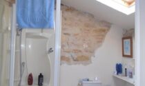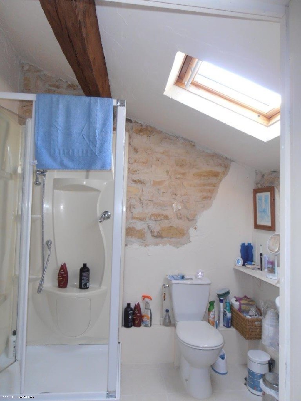 Shower room (4.5m2) Tiles floor. Shower. Basin. WC. Stone walls. Velux. Heated towel rail.