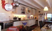 Fitted Kitchen-diner (40m2) Flagstone floor. Beams. Fireplace with wood burner. Door to the front.