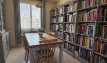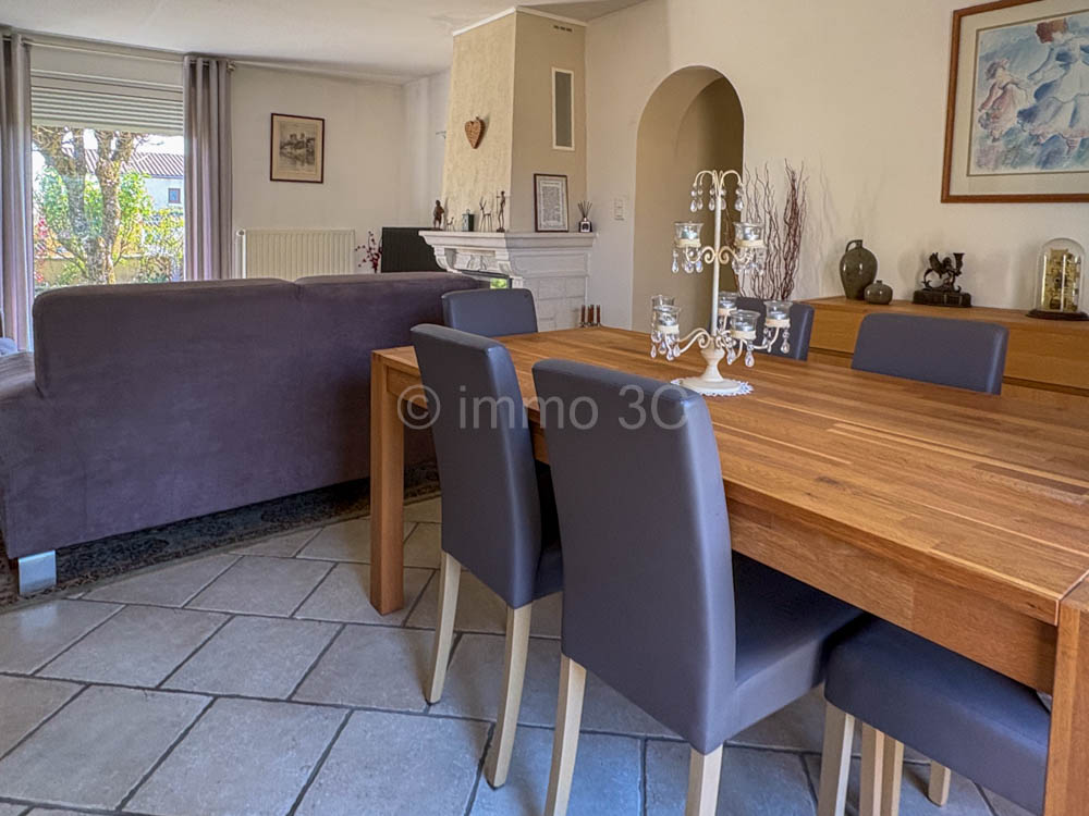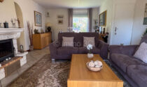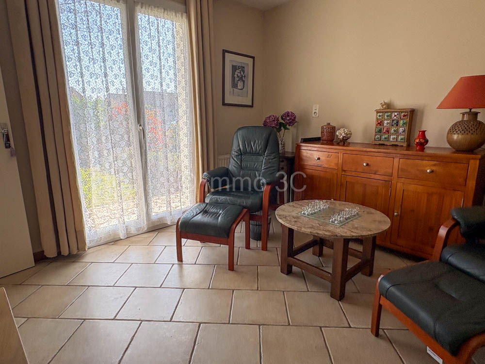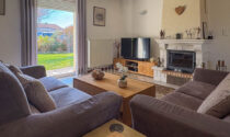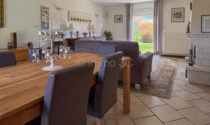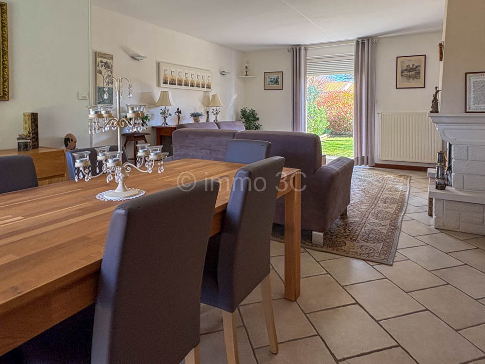 The bright and spacious living room (20 m²) features a wood-burning fireplace with insert, creating a warm and inviting atmosphere.