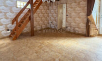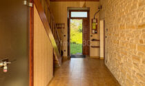 The second part of the house offers additional living space, including a 23 m² kitchen/dining area with a door opening onto the front garden, a spacious 25.5 m² living room with wooden flooring, as well as a bathroom, separate WC, and an attic upstairs that connects to the first part of the house.