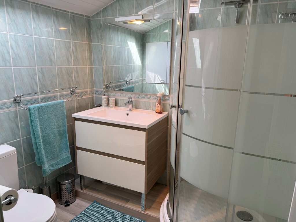 Bedroom (23.73 m², carpet) with en-suite shower room (3.76 m², laminate flooring, WC, washbasin, shower, skylight with blind)