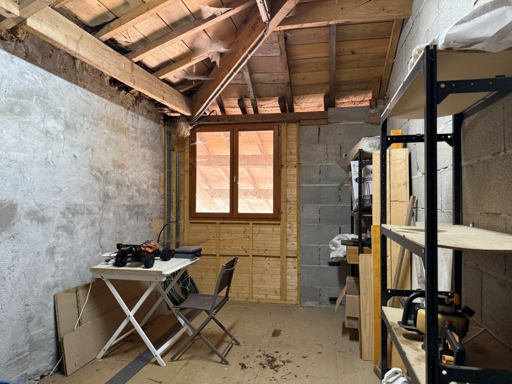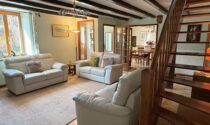 Living room (28.65 m², tiled floor, wood-burning stove, exposed beams)