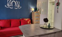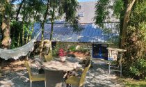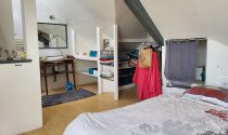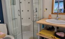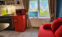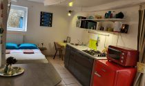 The studio is integrated into a corner of the farmhouse. Entrance hall, fully-equipped kitchen, solar-powered roller shutter, shower cubicle, shower room, view over the park.
