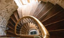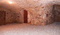 Cellar Brick spiral stairs leading to a vaulted wine cellar.