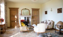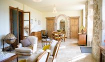 ●Salon/ Dining Room (10.2m x 5.2m) elegant and spacious room with 2 windows and French doors opening onto a beautiful balustraded terrace 20m x 9m, glazed French doors into the hall, feature wall alcove, stone fireplace with double sided log burning stove. new Italian stone tiled floor, built in cupboards